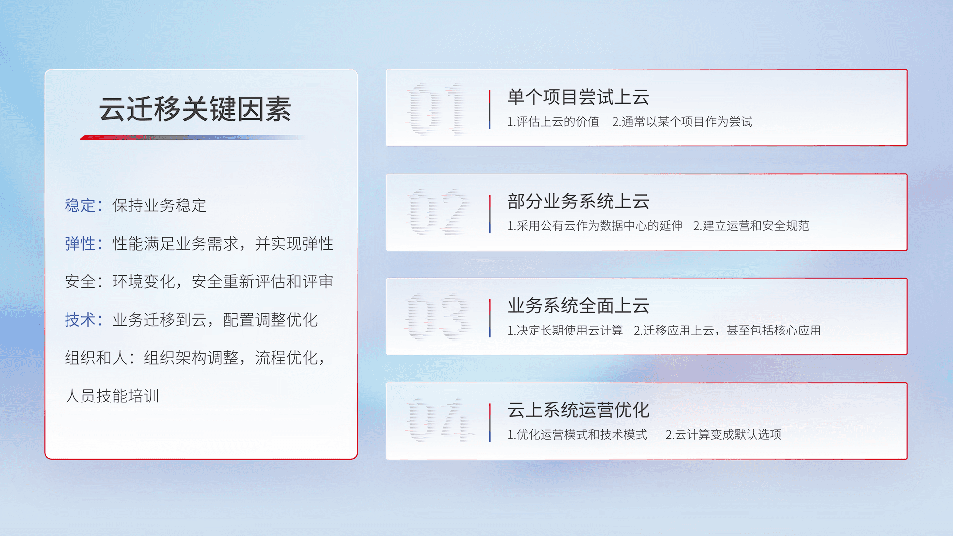 结合实际业务,,,,从规划设计、、、、云平台选型、、云原生改造、、数据迁移、、、、集成交付,,,,迁移全过程为客户识别最佳上云路径,,做好风险识别管理,,设计网络架构、、、、身份权限、、、安全审计合规、、操作审计、、日志审计、、监控告警策略、、、多站点容灾设计等,,,,对云上基础设施进行整体规划,,,,提升IT治理水平,,,以满足弹性、、高可用、、、、高性能的需求。。。。