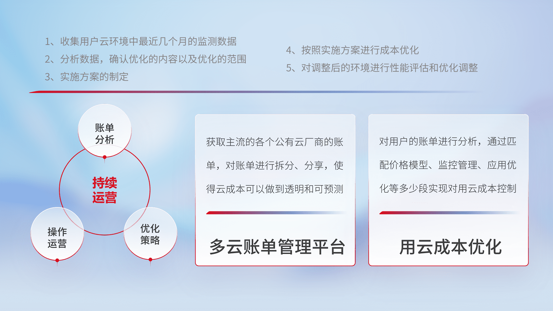 通过多云纳管,,,以统一的资源数据模型把客户的云资源进行抽象和封装,,进而实现对多云资源的统一操作,,保障云资源管理的可靠性、、、、稳定性与可用性。。。量身定制化运维内容,,配置、、开发运维、、、补丁管理、、、备份、、、监控、、、认证和访问管理、、审计和日常巡检等,,保障在用云过程中的可靠度,,,稳定度以及高可用率。。。